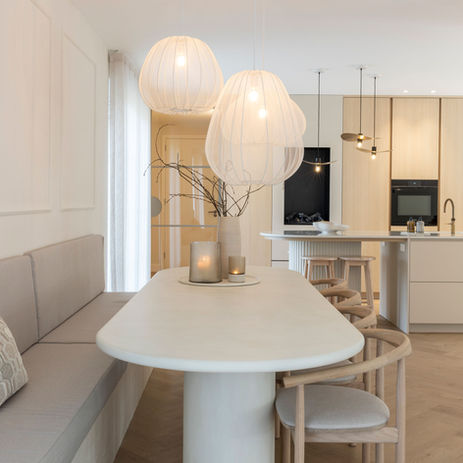 De ruimtes zijn ontworpen als een samenhangend geheel, waarin zachte materialen en verfijnde afwerkingen zorgen voor een tijdloos en chic interieur met een ontspannen sfeer. De indeling voelt open en uitnodigend, met een vleugje landelijke nuance die de ruimte gezellig maakt zonder overduidelijk aanwezig te zijn. Elk element draagt bij aan een interieur dat evenwichtig, sfeervol en op maat voelt - helder van opzet, maar vol detail.